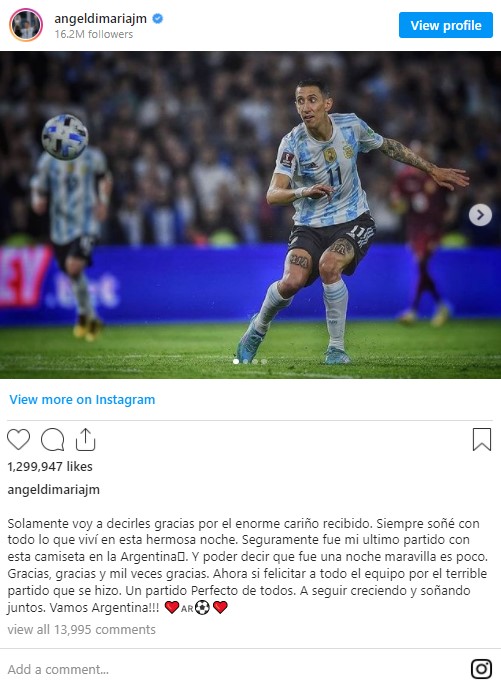 Pero mucho más contundente en sus declaraciones fue Ángel Di María, quien sorprendió con una fuerte publicación en una de sus redes sociales. El jugador convocó la atención de todos ya que se refirió concretamente a su continuidad en la Selección Argentina luego del Mundial de Qatar 2022.