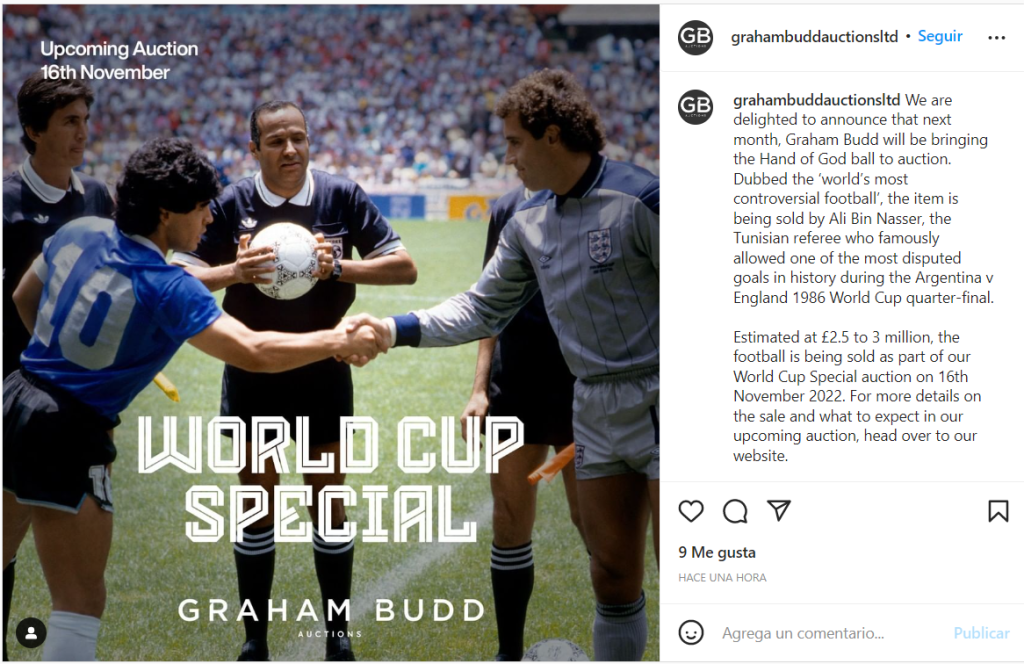“2022 ha sido un año increíble en el mercado de recuerdos deportivos con récords batidos en tres ocasiones. Es un momento emocionante en el mercado y nos preguntamos si este famoso balón también batirá récords. Con la historia que rodea a la pelota, esperamos que este lote sea muy popular cuando salga a subasta”, señaló el subastador Graham Budd, quien también detalló que se podrá empezar a ofertar a partir del 28 de octubre.